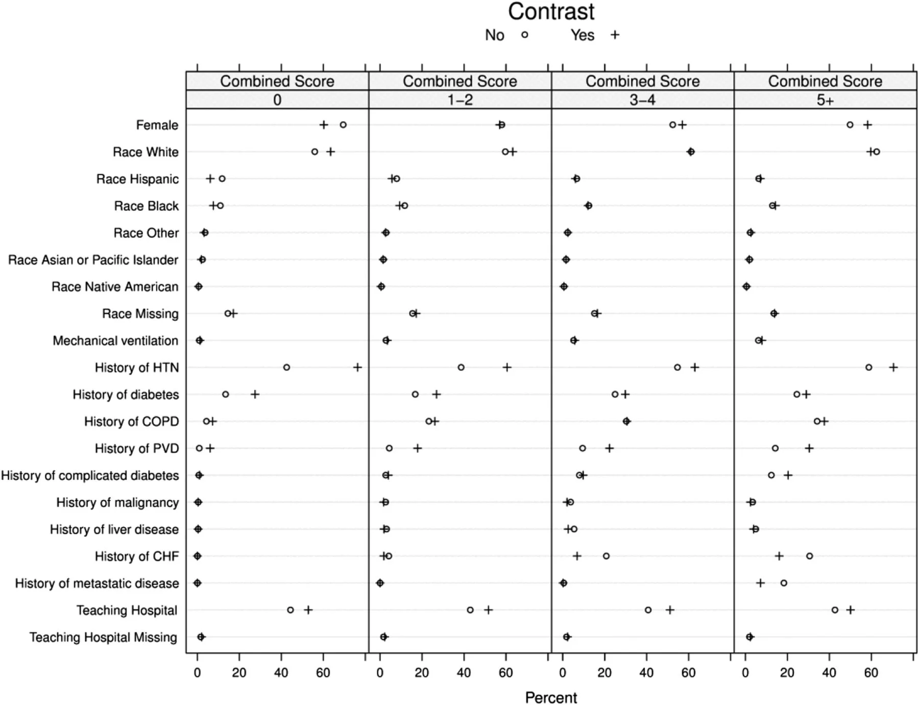 Not surprisingly, patients receiving contrast were older, and also more likely to be white and male. However, patients not receiving contrast had a higher comorbidity score (table 2).