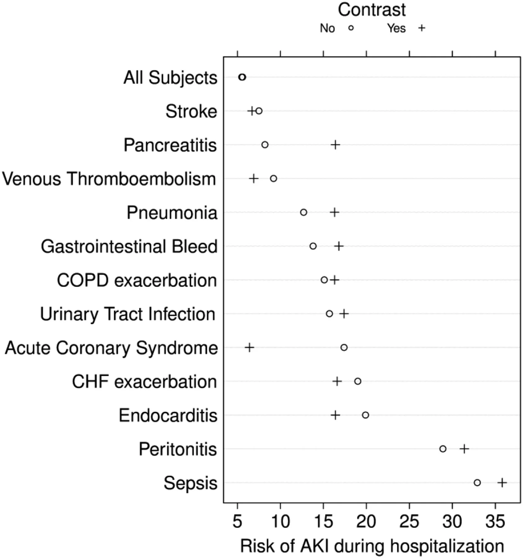 Contrast administration was associated with higher absolute risk of AKI by 2-3% in patients with infections (sepsis, pneumonia, urinary tract infection, peritonitis), COPD exacerbation and gastrointestinal bleeding. Acute pancreatitis doubled the risk.