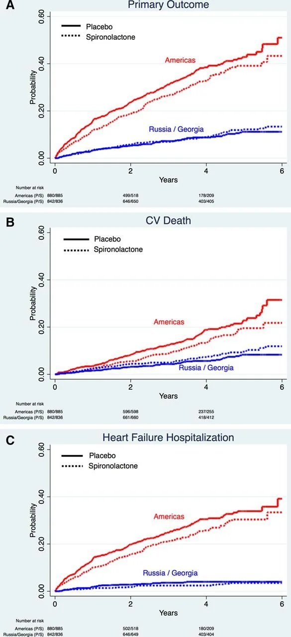 Unfortunately, spironolactone remained the neglected step child. Despite the study above, and subsequent small trials, all we could say was that the addition of spironolactone reduces proteinuria, increases hyperkalemia rates, and the effects on clinical outcomes is uncertain (Navaneethan et al, CJASN 2009). Notably the 11 trials included in the 2009 systematic review include a massive 991 patients, less than a tenth from the combined FIDELITY numbers. Even in the hypertension literature, it was ignored as a first line option in ALLHAT (Furberg et al, JAMA 2002) despite being approved in 1960 by the FDA at the same time as chlorthalidone. Even more heart wrenching was the TOPCAT trial of spironolactone in HFpEF (Pitt et al, NEJM 2014). Due to trial shenanigans in Russia and Georgia (possible inclusion of ineligible patients, intervention groups not even receiving spironolactone, and uncertain outcome ascertainment) nicely detailed here (Pfeffer and Pitt, NEJM Evidence 2022), the official, hard EBM line remained that spironolactone does not work in HFpEF. This is despite the North American TOPCAT data showing a clear benefit (Pfeffer et al Circulation 2014). That has left spiro-stans like us repeatedly saying (to whomever will listen, often just reassuring ourselves) that ‘I am sure spironolactone is just as good as finerenone’ and that the ‘right spironolactone trial just has not been done yet’! But that has changed now.
