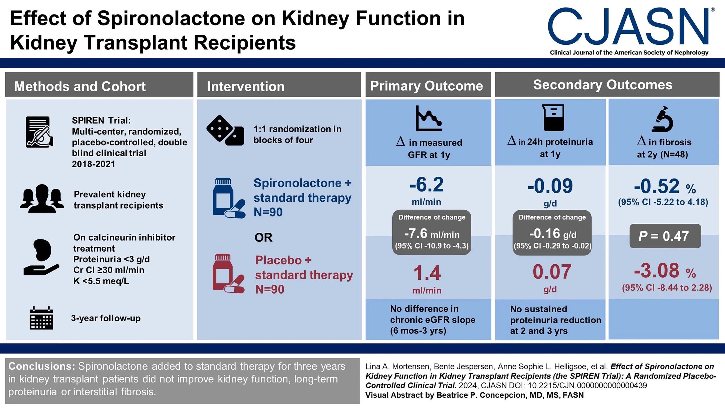 The SPIREN trial was a double blind RCT done at 4 Danish centres, comparing spironolactone to placebo in 180 kidney transplant recipients. The eligibility required these to have a creatinine clearance (with 24 hour urine collections!) of > 30 ml/min, a serum K < 5.5 with no K binder use, and proteinuria < 3 g/day. Notably this is different compared to the finerenone DKD trials which were open to baseline and subsequent use of K binders, and had a minimum proteinuria requirement as well (and allowed in people unless ACR > 5000 mg/g). The primary outcome was a difference in (measured, using nuclear methods) GFR at 3 years, powered for a very optimistic 5 ml/min difference. An interesting secondary outcome was the amount of interstitial fibrosis at 2 years based on protocol biopsies (note one of the purported mineralocorticoid antagonist MoA being the anti-fibrotic effects in the heart). Spironolactone was started at 25 mg daily and increased to 50 mg at 3 months if tolerated.