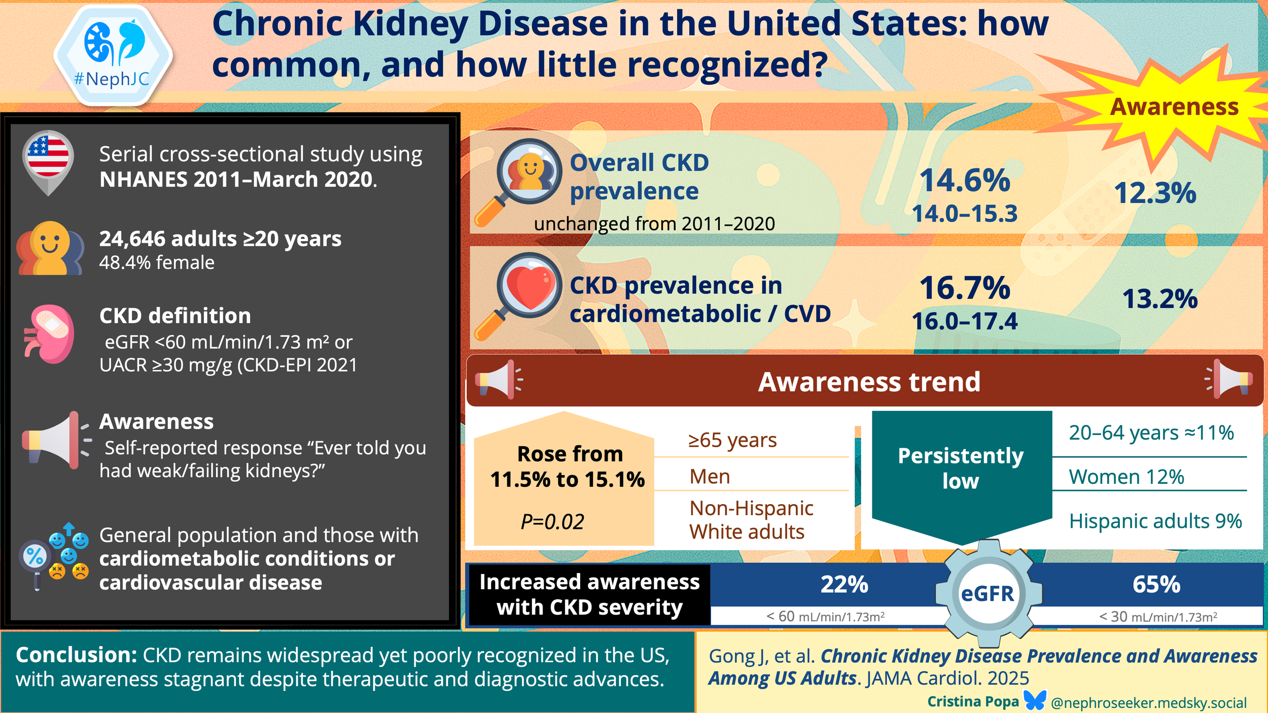 The authors used data from the 2011-2012 to 2017 through March 2020 cycles of the US National Health and Nutrition Examination Survey (NHANES). The latest 2021-2023 NHANES survey cycle was not included, as serum creatinine values have not yet been released (and with funding cuts NHANES may or may not remain alive). The presence of CKD was defined as eGFR < 60 mL/min/1.73 m2 or urineACR > 30 mg/g. CKD awareness was defined as a “yes” response to the question “Ever told you had weak/failing kidneys?” among those with laboratory evidence of CKD.
