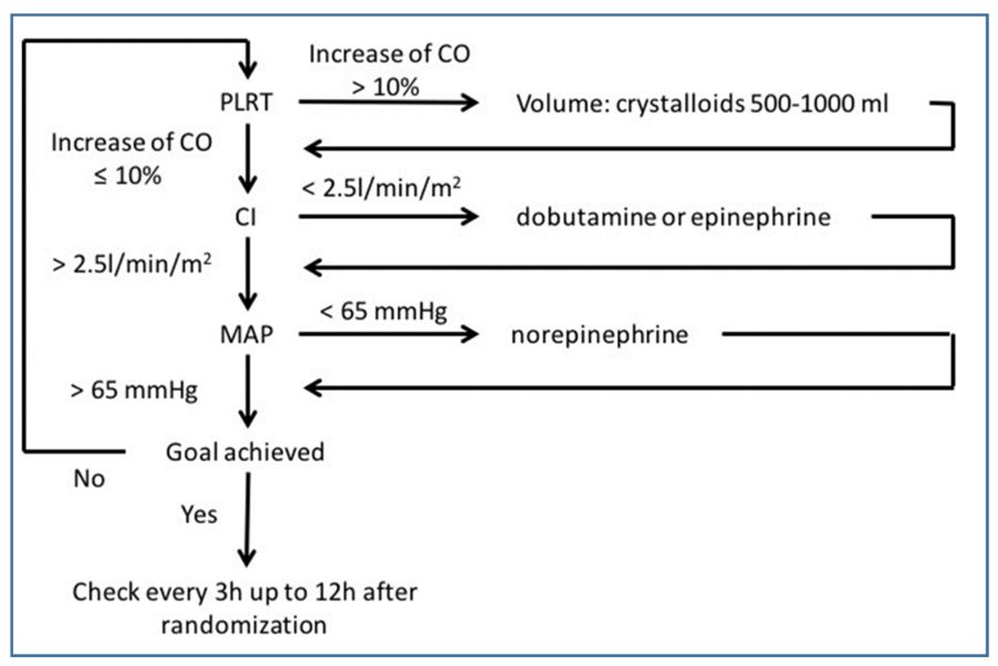 Reassess hemodynamics every 3 hours for 12 hours after randomization