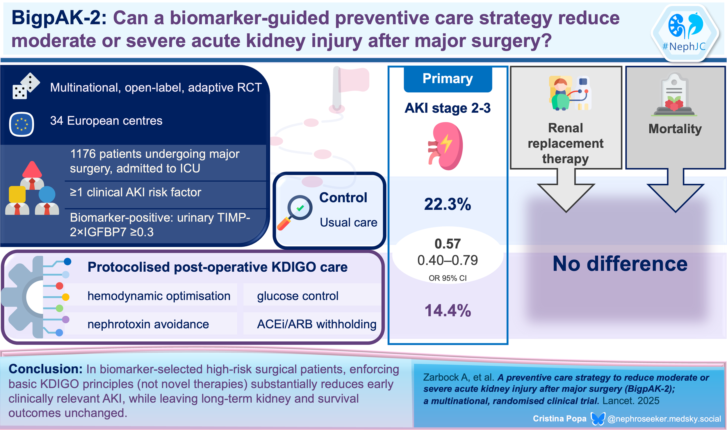 BigpAK-2 asks: if we identify high-risk patients using an early kidney stress biomarker (TIMP-2 x IGFBP7) and then apply a structured KDIGO prevention bundle, can we finally reduce clinically important (KDIGO 2–3) postoperative AKI?