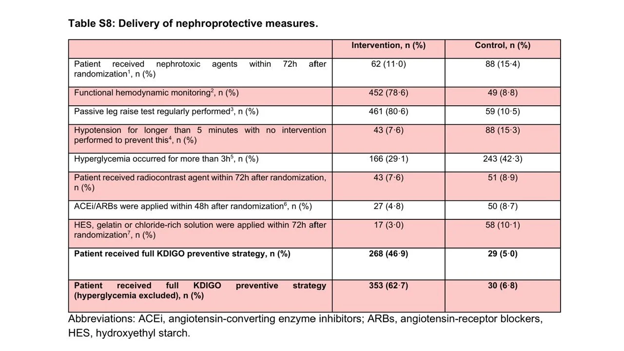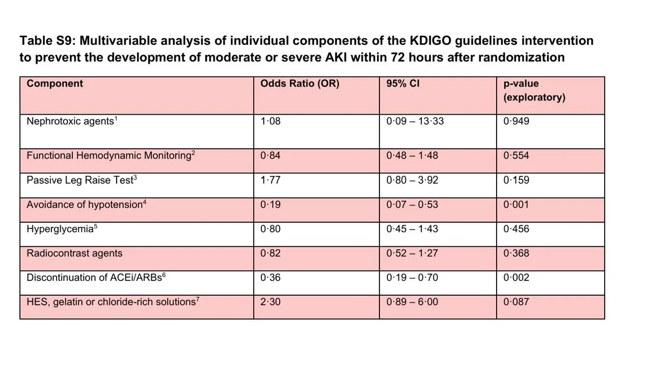 You have to dive deep into the supplement to see which components of the KDIGO prevention bundle were actually followed. Passive leg raising and functioning hemodynamic monitoring were often done – but the other components of the bundle were uncommonly implemented (see below). An exploratory analysis (table S9) suggests that the prevention of hypotension and discontinuation of ACE inhibitors and ARBs had the strongest association with the primary outcome.