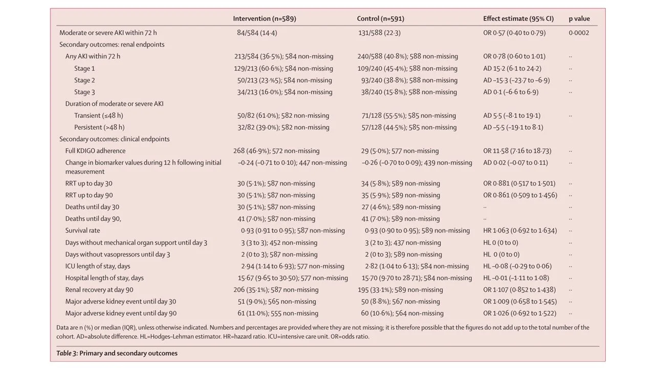 There was huge effect on the primary outcome, the occurrence of moderate or severe AKI within 72 h after surgery, assessed in the intention-to-treat population (HR 0.57, 95% CI 0.40 to 0.79) (see table 3 below). However, there was no significant difference between groups in any-stage of AKI (KDIGO 1–3), RRT at 90 days, mortality, or MAKE90. Interestingly, the change in the biomarker (Nephrocheck), which is a supposed to be a sensitive signal of kidney injury, was also not significant (-0.24 and -0.26).