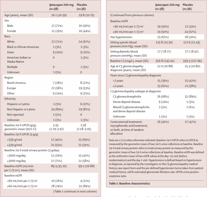 132 participants were screened, and 56% (n=74) were randomised 1:1 to iptacopan versus placebo. The mean age was 27.9 years, 64% were male, and 69% white. Mean eGFR was lower, and 24 hr UPCR was higher in the iptacopan group at baseline. 99% of patients were on RAS blockers and 45% on immunosuppressants at the time of randomization.