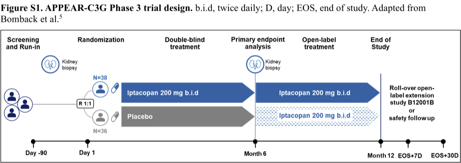 The APPEAR C3G trial was a double blind, multicentre, placebo-controlled RCT funded and designed by Novartis which enrolled 74 patients from 35 centres across 18 countries and randomized them 1:1 to iptacopan 200 mg bd vs placebo. Randomization was stratified by treatment with corticosteroids, mycophenolic acid, or both (yes or no). It consisted of a 90-day screening and run-in period, 6 months double blind treatment period, and 6 months of open-label extension, where both arms were treated with iptacopan.