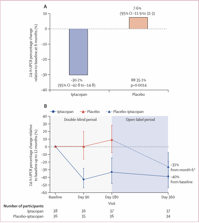 Figure 2. Percentage change in proteinuria (24-h UPCR) following treatment of iptacopan or placebo relative to baseline at 6 months (A) and up to 12 months (B), from Kavanagh et al, Lancet 2025
