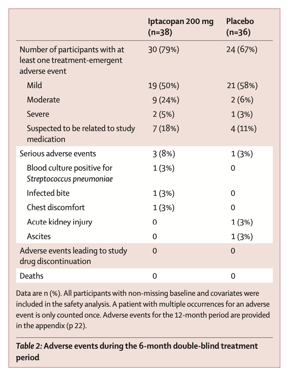 Treatment-emergent adverse events occurred in 79% of iptacopan vs 67% of placebo recipients; most were mild or moderate. Serious adverse events were infrequent (8 vs 3%), with no deaths, no discontinuations because of treatment-emergent events, and no meningococcal infections.