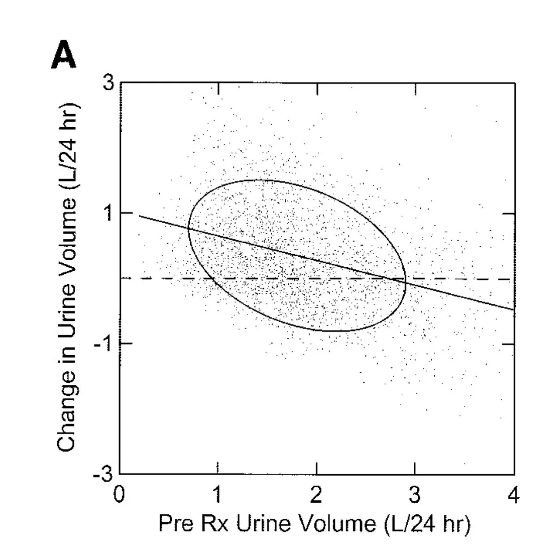 Only patients with less than 2 liters of urine were randomized, exactly the patients we tell to drink more water. This setup raises a concern: regression to the mean could inflate urine improvements in both groups.