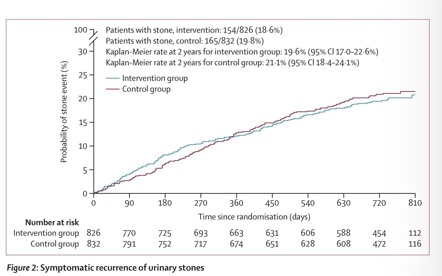 After 2 years 19% in the intervention group had a stone events compared to 20% in the control group. No signal.