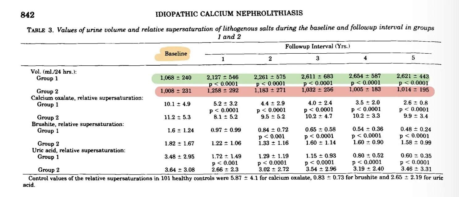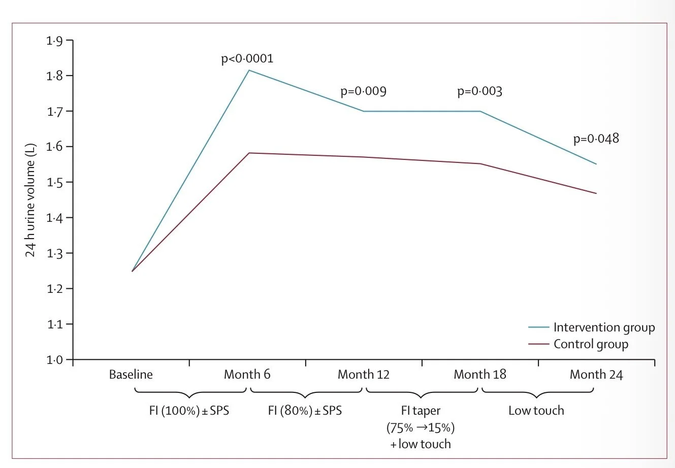 People told to drink a lot of water immediately doubled their urine output and over time further increased their urine output to 2.6x their baseline urine volume. Patients in the control group had a modest 20% increase in urine volume for the first year and then reverted back to their baseline urine volume for years 2-5.
