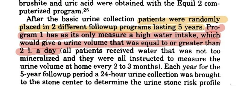 The most important study is an Italian RCT by Borghi, Urinary volume, water and recurrences in idiopathic calcium nephrolithiasis: a 5-year randomized prospective study (J Urol 1996) These guys enrolled patients, after their first kidney stone and randomized them to either: