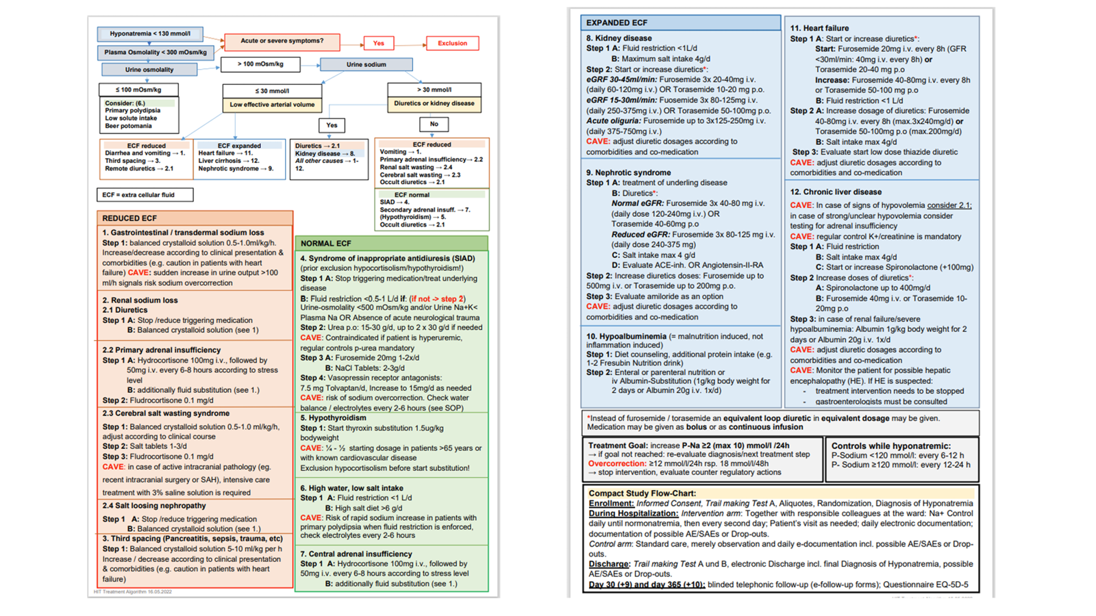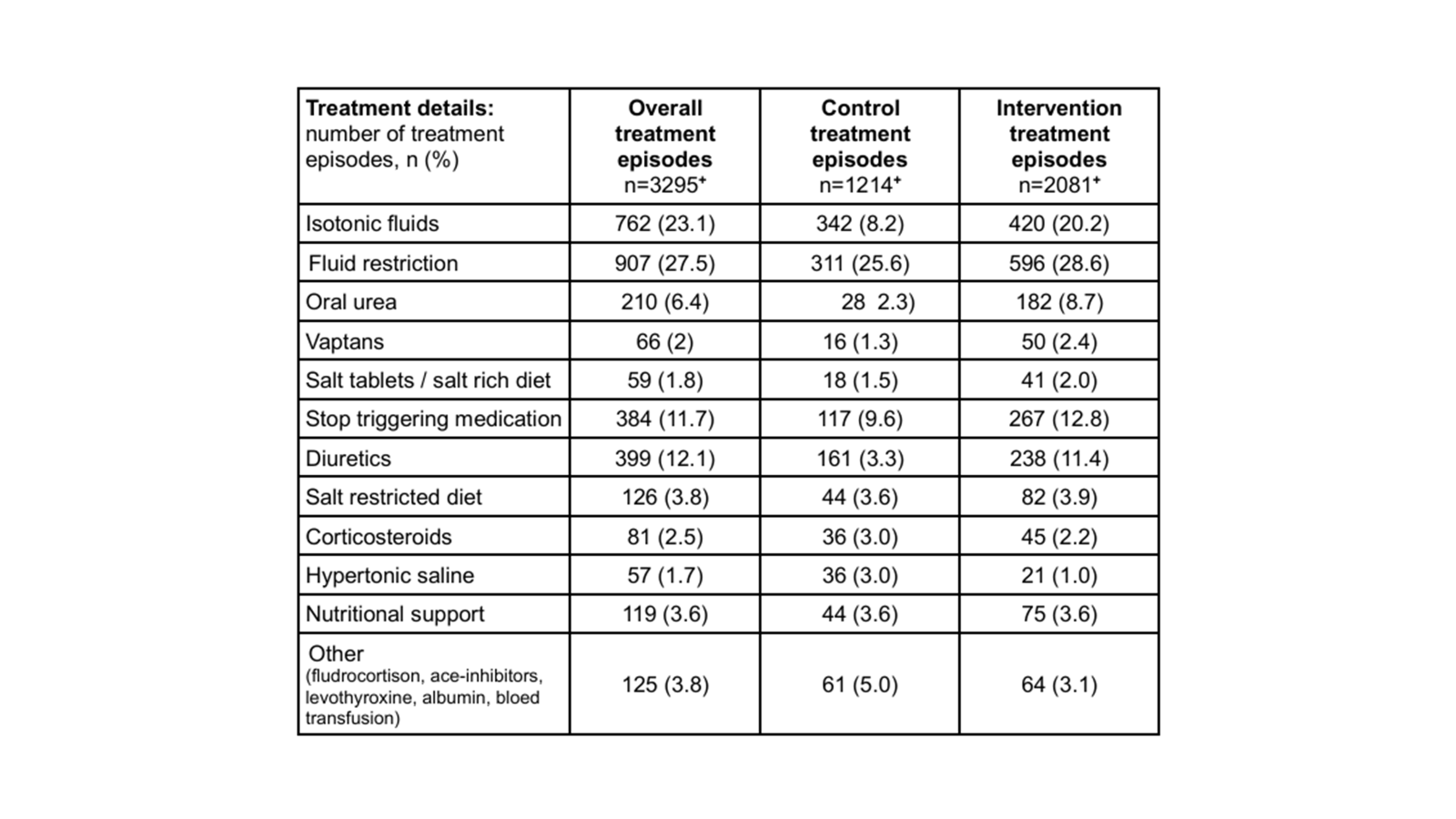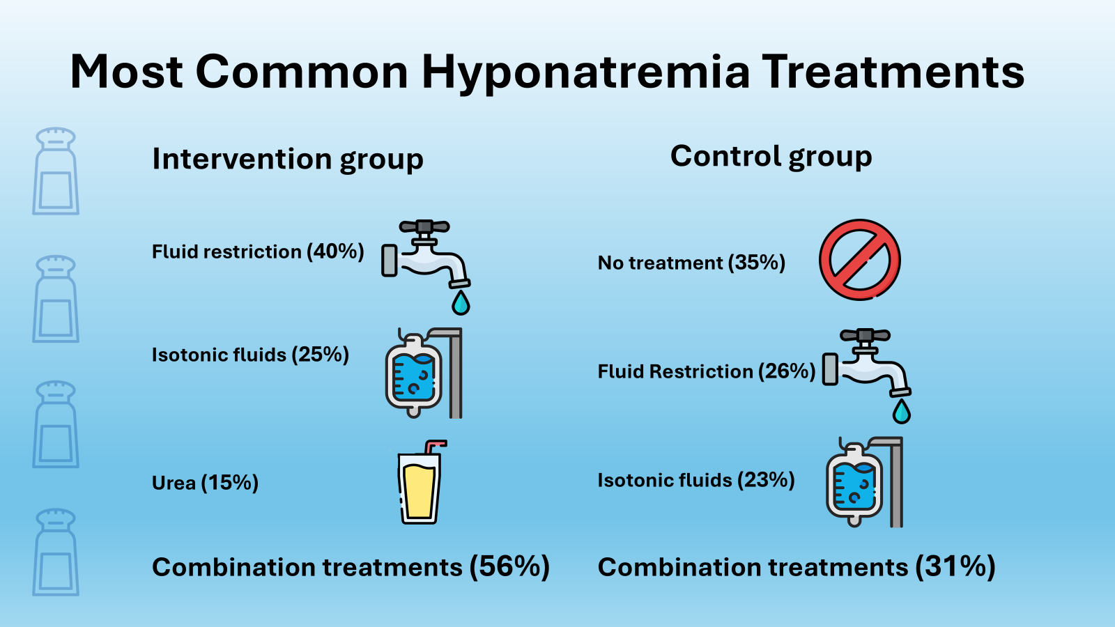 In the control group, patients received usual care, meaning hyponatremia was managed as in routine practice. Although described as “based on the European guidelines” (Spasovski et al, Eur J Endocrinol, 2014), no structured algorithm or treatment targets were mandated. Clinicians followed general principles, but therapy could range from active treatment to observation, and escalation to achieve normonatremia was not required. This contrasts with the intervention group, where care followed a predefined, stepwise protocol aimed at sodium normalization. Treatment decisions and sodium values were recorded retrospectively from the medical record after discharge.