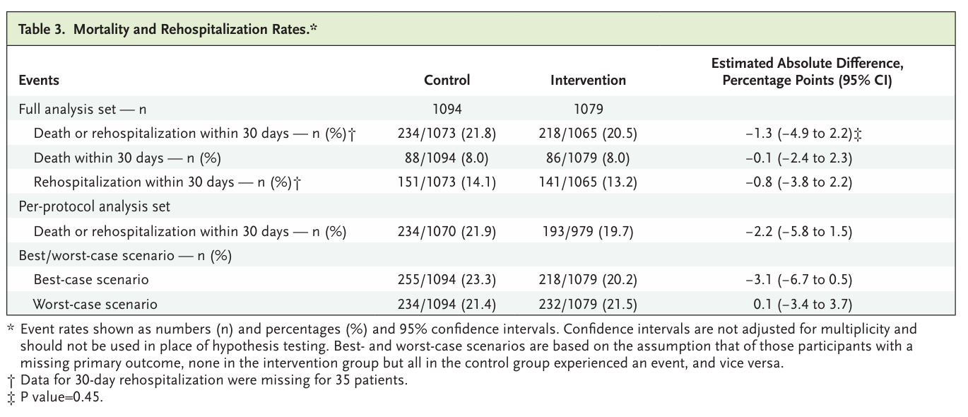 Death or rehospitalization within 30 days of study inclusion occurred in 218 intervention patients versus 234 control patients (estimated absolute difference -1.3%; 95 CI: -4.9 to 2.2, p = 0.45). The observed event rate and sample size were consistent with the prespecified power assumptions. The finding was consistent when correcting for potential site effects, as well as best and worst-case scenario analyses, in which missing 30-day outcomes were assigned extreme assumptions favoring either the intervention or control group.