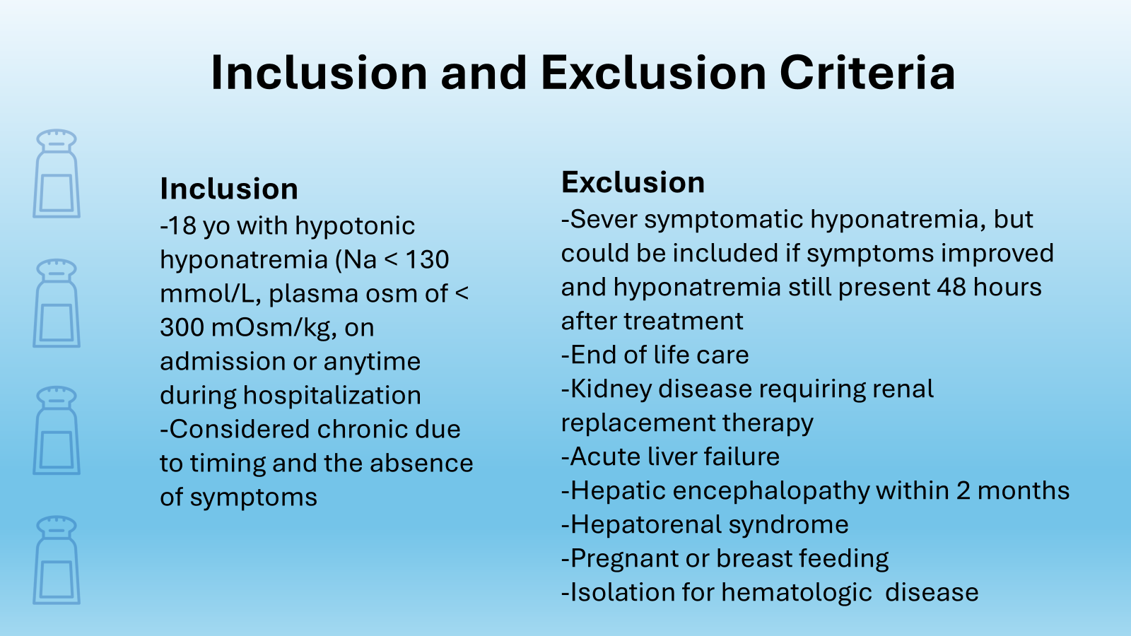 Plasma sodium levels were reviewed by local trial physicians. Patients were invited to be included once hypotonic hyponatremia was confirmed (Na < 130 mmol/L, plasma osmolality ≤ 300 mOsm/kg). Hyponatremia could have occurred prior to, or during hospitalization. Patients could be enrolled anytime during their hospitalization. Initial assessment included reason for hospitalization, comorbidities, and additional lab values. A cognitive assessment was done with the Trail Making Test (essentially a connect-the-dots in numerical order).
