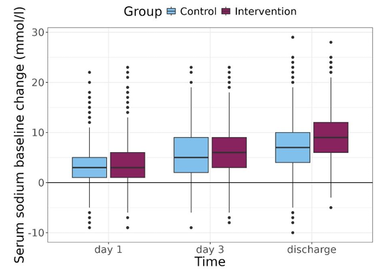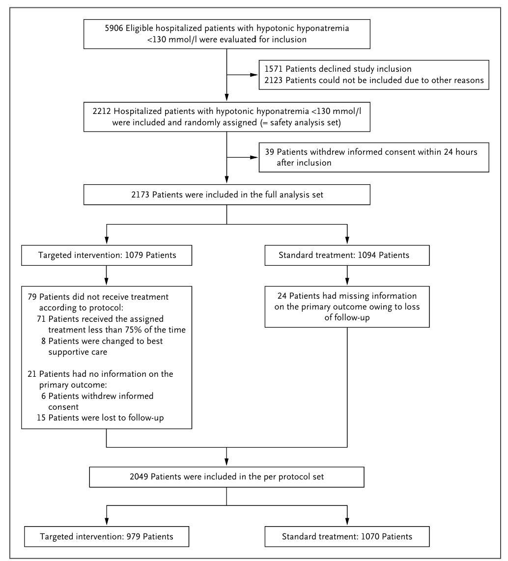 Patients were then randomly assigned 1:1 to either targeted plasma sodium correction (intervention) or standard treatment (control). Treating physicians in the control group were not restricted from correcting hyponatremia. Therefore, sodium correction also occurred in the standard-of-care arm, consistent with the pragmatic design.