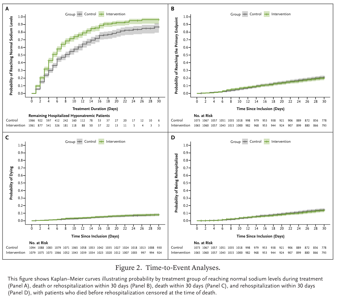 This study found no significant difference in its primary outcome. However, the difference between treatment strategies was small (only 1.3 mmol/L higher in the intervention group), and therapies were not necessarily continued after discharge from the hospital setting. Despite greater normalization of sodium in the intensive group, there was a significant portion of patients who had recurrence of hyponatremia at 30 days (approximately 42% in both groups). Also, the use of therapies further down the algorithm was limited: only 8% were prescribed urea, and 3% vaptans. One could argue that urea is cheap, safe, and effective and could be used more (beyond what the guidelines call for). On the other hand, the vaptans are costly and do have significant side-effects (including liver toxicity and increased risk of GI bleeding) that might have limited their use, even in severe cases. One is left wondering if perhaps the intensive arm wasn’t intensive enough to make a significant difference. Especially since 40% of patients were discharged with uncorrected sodium levels. If we want to test if fixing the sodium makes a difference, we should use an algorithm that does a better job of fixing the sodium.