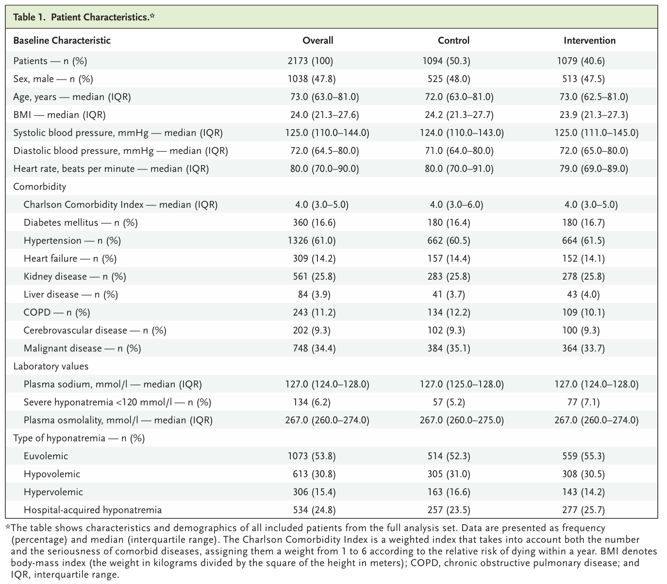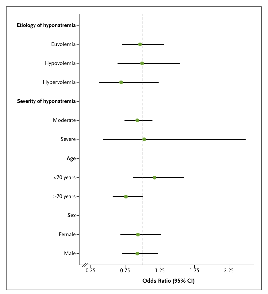 The primary analysis followed a modified intention-to-treat approach, including all randomized patients who remained in the study for at least 24 hours. Predefined subgroups included severe hyponatremia (Na < 120), etiology, age (< or > 70 years), and sex. Secondary outcomes were considered exploratory without plans for multiple comparisons or adjustment of confidence intervals.