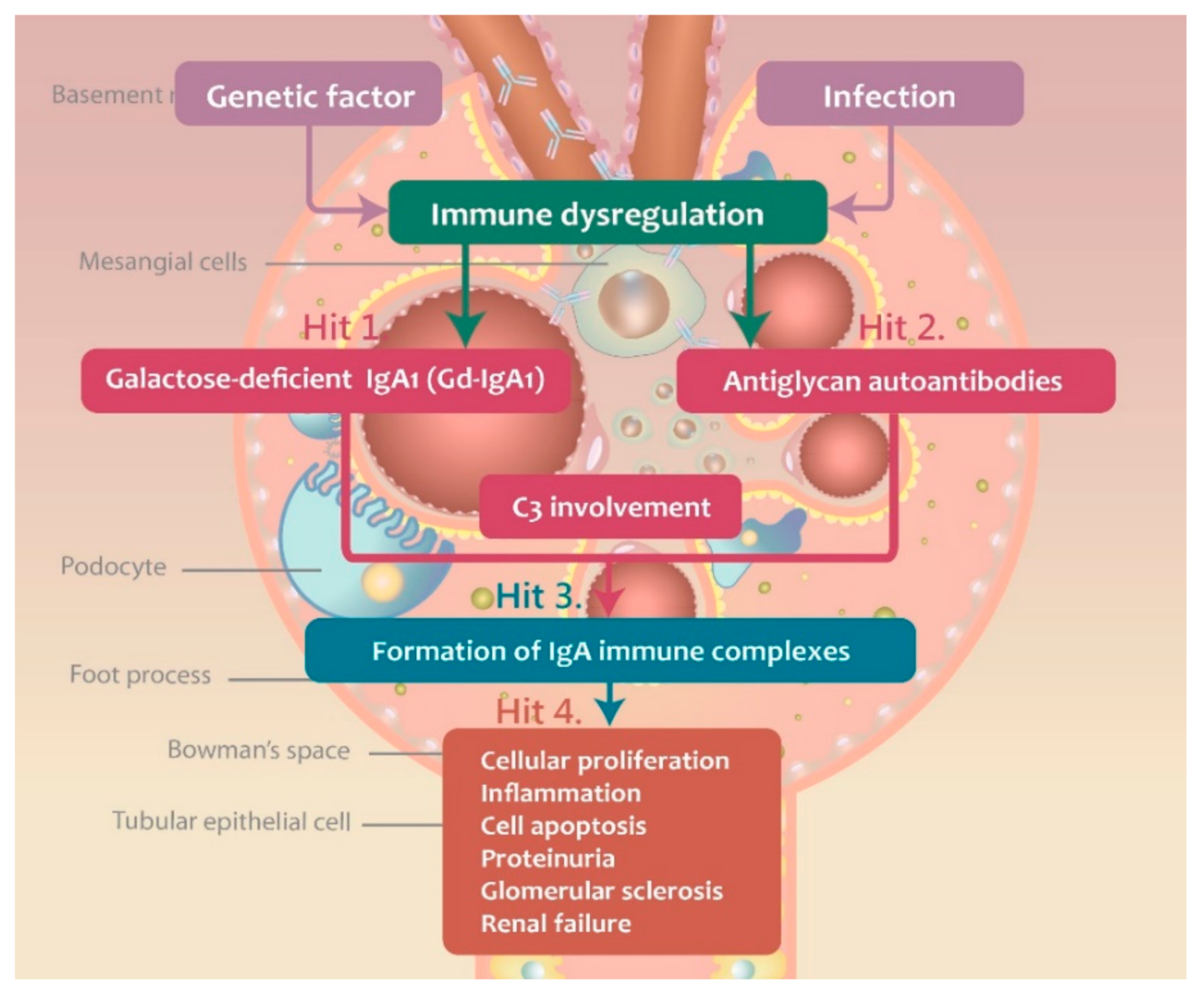 Figure 1. “Multi-hit” model hypothesis describing the pathogenesis of IgAN, from Wu MY, et al. J Clin Med, 2018.