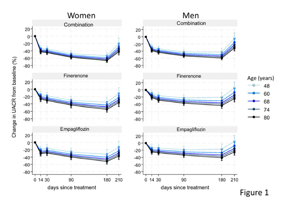 Figure 1. Mean change in UACR from baseline by treatment group as a function of age and sex, from Agarwal et al, NDT, 2026