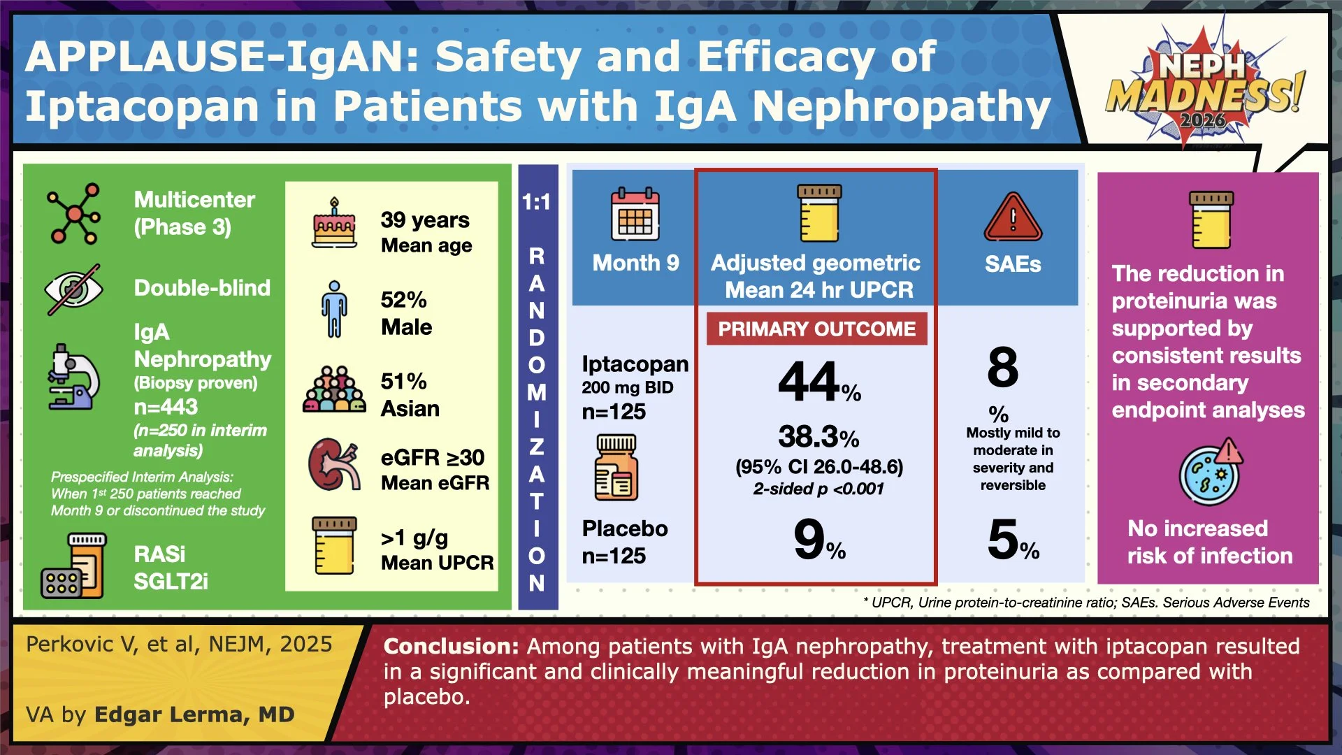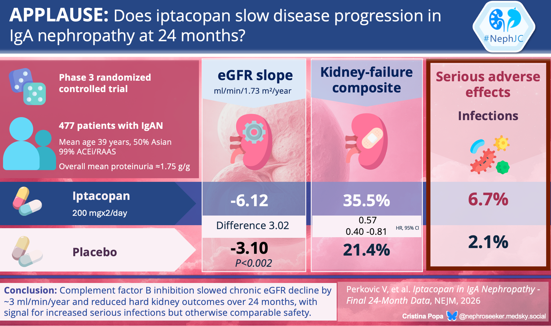 Clearly, trial results deserved the APPLASE it received at the presentation. Iptacopan does slow kidney disease progression at 24 months in IgAN, and seems safe in this large phase 3 trial. Notable aspects of the trial results are the substantial 3 ml/min/year GFR decline that still occurred in the iptacopan group (compared with presented telitacicept data of almost no decline, while atacicept data is awaited), the rapid proteinuria reduction with iptacopan, and the higher infection rates despite prior vaccination and close care provided in the trial setting.