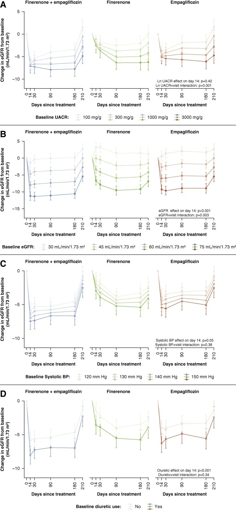 In the mediation analysis (table 3, below), comparing the effect on UACR at 180 days that was mediated by the acute eGFR decline, this contribution was seen much more in combination versus finerenone (28%) than combination versus empagliflozin (5.2%), suggesting little of the additional benefit provided by finerenone is mediated by the acute eGFR decline.