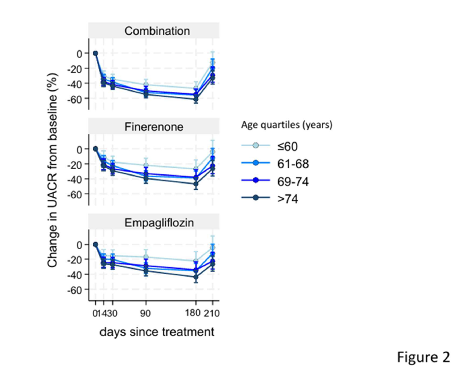 Figure 2. Mean changes in UACR from baseline by treatment group as a function of age quartile, from Agarwal et al, NDT, 2026