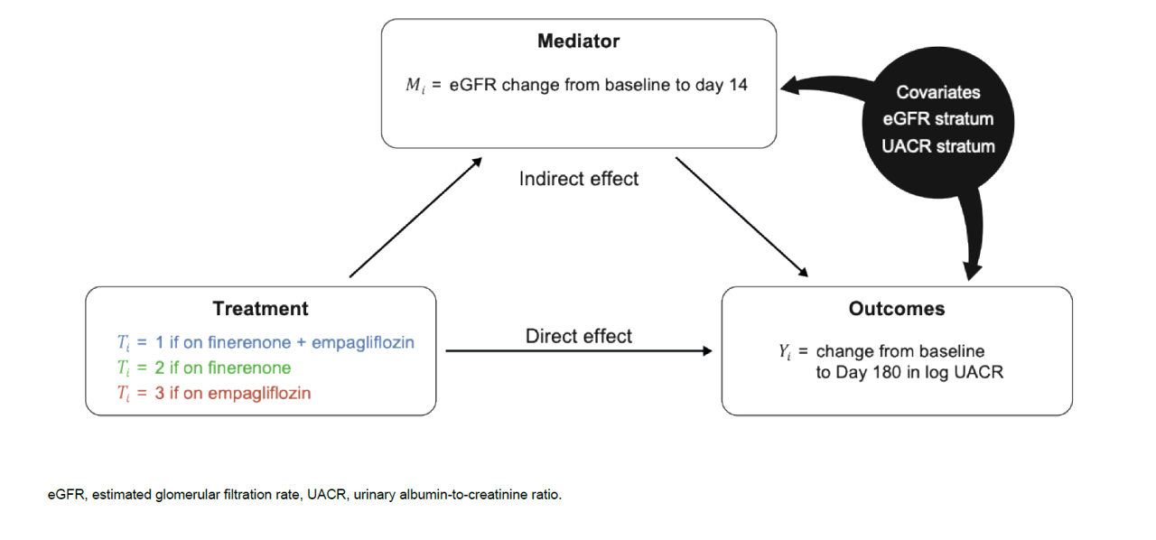 This analysis is somewhat similar to the one published in Annals for FIDELITY (Agarwal et al, Annals of IM 2023), but now applied to CONFIDENCE. In this exploratory analysis of the CONFIDENCE trial, the purpose was to ascertain if the acute eGFR decline (defined as > 30% from baseline to day 14) mediated the treatment effect of the interventions on the primary outcome (UACR decrease at 180 days). A linear mixed model using fixed effects was used for acute eGFR decline estimations. For more on mediation analysis, check out this helpful tutorial (Lange et al Epid Health 2017).