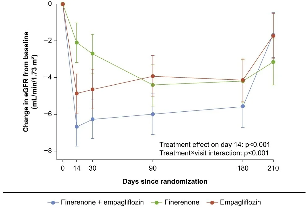 The acute decline in GFR (> 30 at 14 days) was, as expected, highest in the combination, followed by empa and then finerenone - but the nadir came earlier (at day 14) for the combo and empa, and much later (~ day 90) for finerenone.