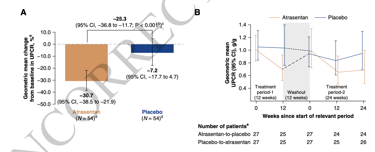 Overall, 54 patients were randomized, with a median GFR of 63 and UPCR of 1 g/g, and were mostly (65%) White. Only 13% were non-flozinated at baseline, requiring a flozin run-in phase. Atrasentan reduced proteinuria by 30% (versus 7% in placebo), thus hitting the powered for target and coming in at −25.3% (95% CI, −36.8 to −11.7; p < 0.001). Treatment sequence did not matter, and for those in sequence two who went on to receive atrasentan, there wasn’t much more of a proteinuria decrease at 24 weeks (treatment difference of -26.4% versus placebo).