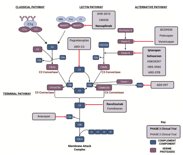 Mechanism: the alternative complement pathway has been reported to be a driver of glomerular inflammation and injury in IgAN (Medjeral-Thomas et al, Semin Immunopathol, 2021). As Jon Barratt points out in his NephMadness commentary, it has been universally noted that for every bit of IgA deposited within the glomerulus, there is accompanying C3. The deposition of galactose-deficient IgA1 (Gd-IgA1) immune complexes in the mesangium activates the alternative pathway, leading to the formation of C3 and C5 convertases and the terminal membrane attack complex (MAC), which mediate tissue damage (Teh et al, AJKD, 2026). Iptacopan is a first-in-class oral inhibitor of Factor B, an important component of the alternative pathway C3 convertase. By selectively blocking the alternative pathway, it targets a central step in the disease’s inflammatory cascade without affecting the classical or lectin pathways, theoretically offering a more precise therapeutic strategy (Schubart et al, Proc Natl Acad Sci USA, 2019| Risitano et al, Lancet Hematol, 2021). Since we all need reminders of (or have nightmares of trying to remember) the complement pathway, here it is, along with the various therapeutic targets developed or in development.