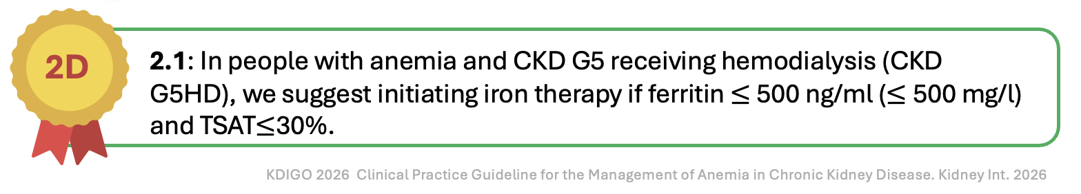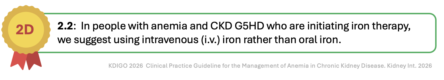 Two issues dominate this chapter: when to start iron and how to give it. KDIGO 2026 answers both, but with explicit acknowledgment that much of the evidence remains of low certainty.