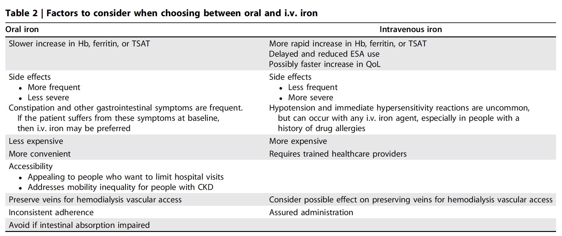 Table 2. IV versus oral iron, from 2026 Clinical Practice Guideline for the Management of Anemia in Chronic Kidney Disease