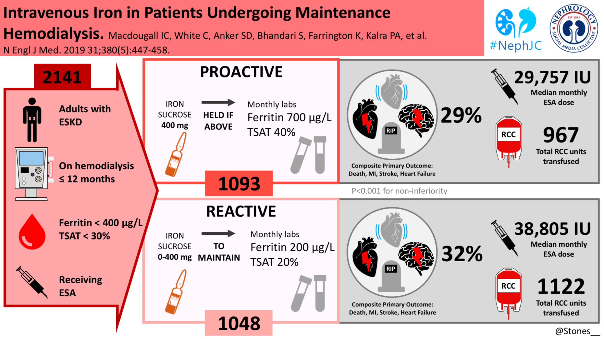KDIGO’s 2.1 adopts the same ferritin ≤500 ng/mL/ TSAT ≤30% cut-off that existed in the 2012 guideline, but now couples it with a proactive IV-iron regimen (400 mg monthly, unless ferritin >700 ng/mL). The logic rests almost entirely on the PIVOTAL trial (Macdougall et al, NEJM 2019| NephJC summary). PIVOTAL (2141 patients with incident HD) compared proactive IV iron with a reactive protocol that gave iron only when ferritin fell <200ng/mL or TSAT <20%. The proactive arm used less ESA (~25% lower) and achieved a modest hemoglobin advantage. The primary composite cardiovascular endpoint showed an HR of 0.85, but the 95% CI (0.73-1.00) demonstrating a CV benefit with proactive iron approach (whether driven by more iron, less ESA, or higher Hgb will remain a topic of debate). KDIGO extrapolates the trial’s protocol (withholding iron only when ferritin >700ng/mL), which is reasonable given that PIVOTAL demonstrated it is safe to go beyond the arbitrary 500 to 700. Interestingly, the smaller and shorter DRIVE trial is ignored (Coyne et al, JASN 2007), which demonstrated the safety of IV iron to a ferritin of 1200, though without any CV outcome data.