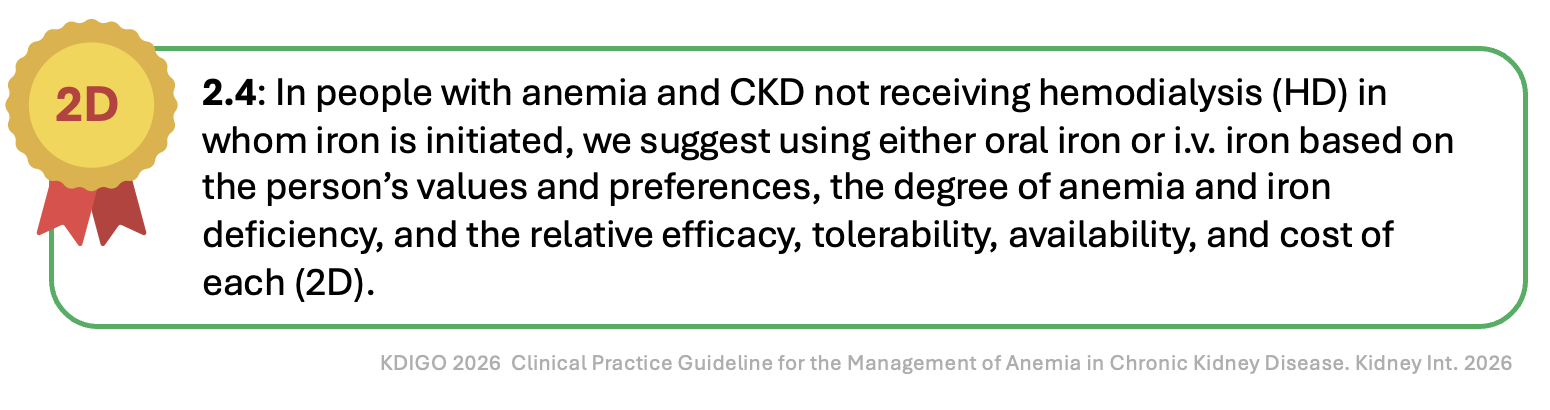 This recommendation acknowledges the uncertainty by urging shared decision-making. It correctly notes that oral iron is cheaper, less invasive, and often sufficient, while IV iron gives a bigger Hb boost. The recommendation’s strength (2D) mirrors the modest efficacy gap (~0.3-0.7g/dL) and the lack of mortality data. In practice, many clinicians will try oral iron first, reserving IV for intolerance or failure after 1-3 months- exactly what KDIGO suggests, albeit in a more verbose, less decisive fashion.