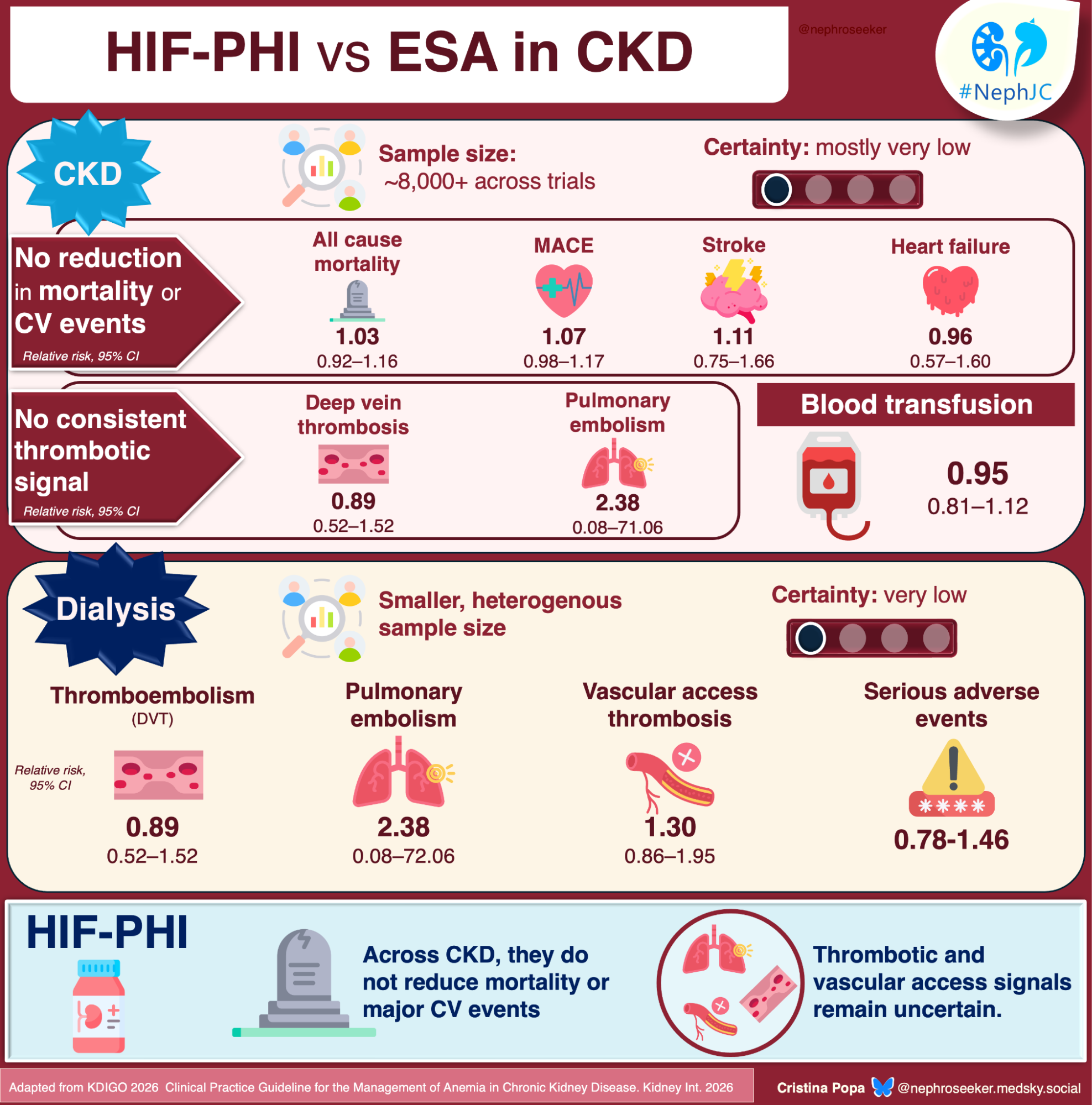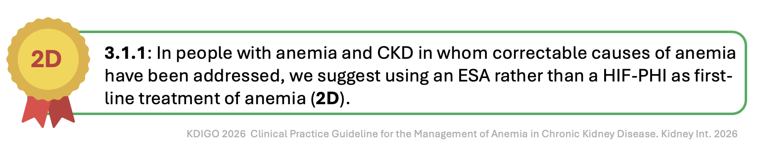 For four decades, Erythropoiesis-Stimulating Agents (ESAs) have dominated CKD anemia management. They reliably raise hemoglobin, reduce transfusion need, and improve quality of life, outcomes demonstrated in many trials. Then came the hypoxia-Inducible Factor–Prolyl Hydroxylase Inhibitors (HIF-PHIs), oral agents that stabilize HIF- ⍺, upregulate endogenous erythropoietin, and reduce hepcidin-driven iron sequestration. They promise convenience, mechanistic elegance, and potentially reduced iron requirements. Yet their long-term safety remains uncertain. The 2026 KDIGO update attempts to reconcile the long-term safety data of ESAs with the newer, oral, but safety-uncertain HIF-PHIs. The basic clinical dictum of correcting potentially reversible causes of anemia before initiation of these agents remains constant and has been well emphasized by the guidelines. Many patients won't need additional medications if iron is optimized. Discuss symptoms, transfusion risk, and medication risks (stroke, thrombosis, cancer progression) with patients when trying to make an anemia plan.
