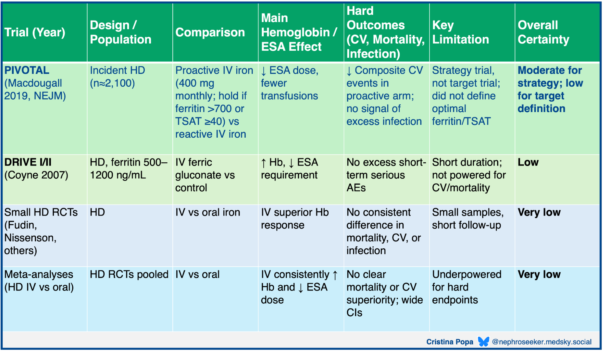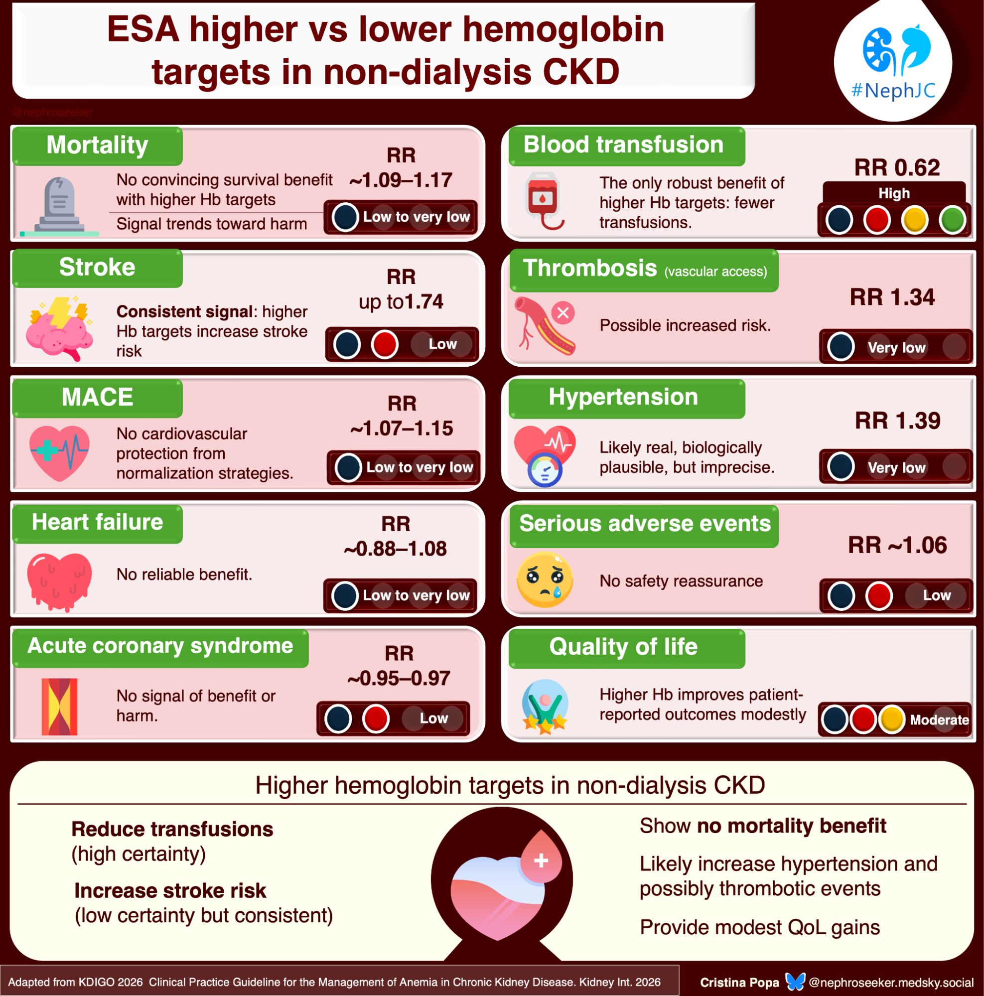 KDIGO 2026 recommends maintaining Hb below 11.5 g/dl in adults on ESA therapy. This is the guideline’s strongest recommendation (1D- strong recommendation/very low certainty), a rare combination reflecting both mechanistic conviction and explicit acknowledgment of weak evidence. It’s very logical: ESA trials targeting higher hemoglobin (≥12.6-14 g/dL) consistently increased stroke, vascular access thrombosis, and cardiovascular events compared with lower targets (10-11 g/dL). The CHOIR trial randomized 1432 patients with non-dialysis CKD to Hb targets of 13.5 vs 11.3 g/dL and was terminated early after detecting a hazard ratio of 1.3 for the composite of death, MI, heart failure hospitalization, or stroke in the high-target arm (Singh et al, NEJM, 2006). The TREAT trial in diabetic CKD similarly found increased stroke with the darbepoetin targeting Hb ≥ 13g/dL (Pfeffer et al, NEJM, 2009). Notably, CHOIR and TREAT were trials of ESA dosing strategies, in addition to Hb targets (TREAT required rescue doses of darbepoetin if Hb < 9 g/dL). The achieved hemoglobin in the “high target” arms was often lower than intended (e.g. CHOIR achieved 12.6 g/dL in the high target group, despite aiming for 13.5), and one still cannot help but ask: was it the ESA or the “high” hemoglobin target that was problematic? Why does it matter? If the culprit is ESA dose rather than Hb level, then a non-dialysis patient who achieves Hb 13 g/dL on very low ESA doses might face less risk than current evidence suggests. This was also the era of lower iron targets (see above) so that also should be taken into considerations. With more (proactive) iron use, ESA doses are typically lower.