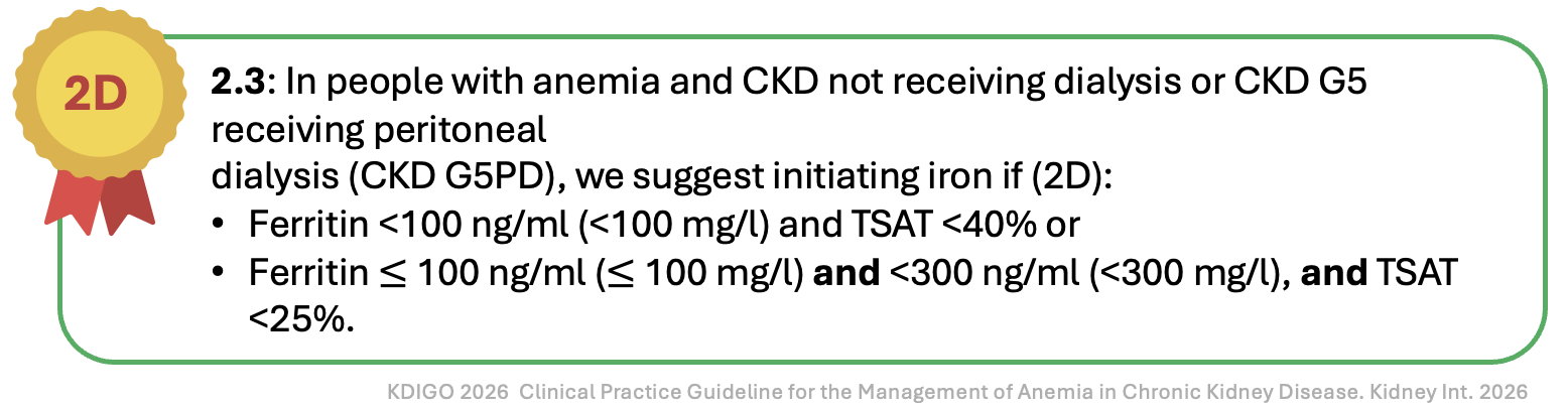 Recommendation 2.3 dramatically lowers the ferritin bar for non-dialysis CKD (to <100 ng/mL) or 100-299 ng/mL with a tighter TSAT<25%. The change is driven by the FIND-CKD (Macdougall et al, NDT, 2014) and REVOKE (Agarwal et al, Kidney Int, 2015| NephJC summary) trials, both tiny. FIND-CKD showed that IV ferric carboxymaltose raised Hb by ~0.7 g/dL more than oral iron over 12 weeks; REVOKE showed a similar modest benefit, but reported more adverse events with IV Iron. Neither trial tested the specific thresholds that KDIGO now recommends, and both were underpowered to detect hard outcomes. The 2D grade, therefore, reflects that KDIGO took the inclusion criteria of these trials (ferritin < 300ng/mL) and turned them into treatment cut-offs.