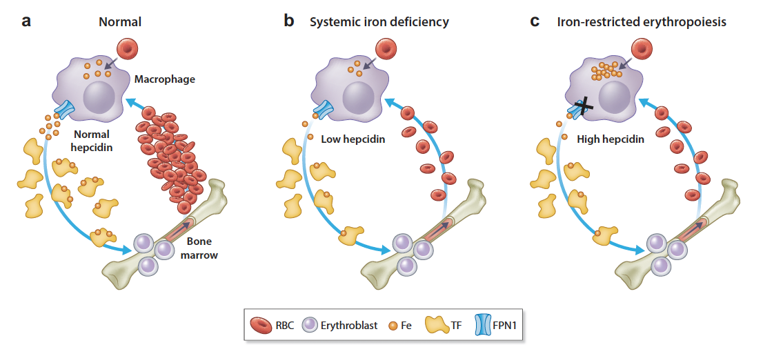 Previously “functional iron deficiency” → now iron-restricted erythropoiesis (low TSAT despite normal/high ferritin; iron trapped in stores, often hepcidin-driven, limiting erythroid use despite apparent adequacy).