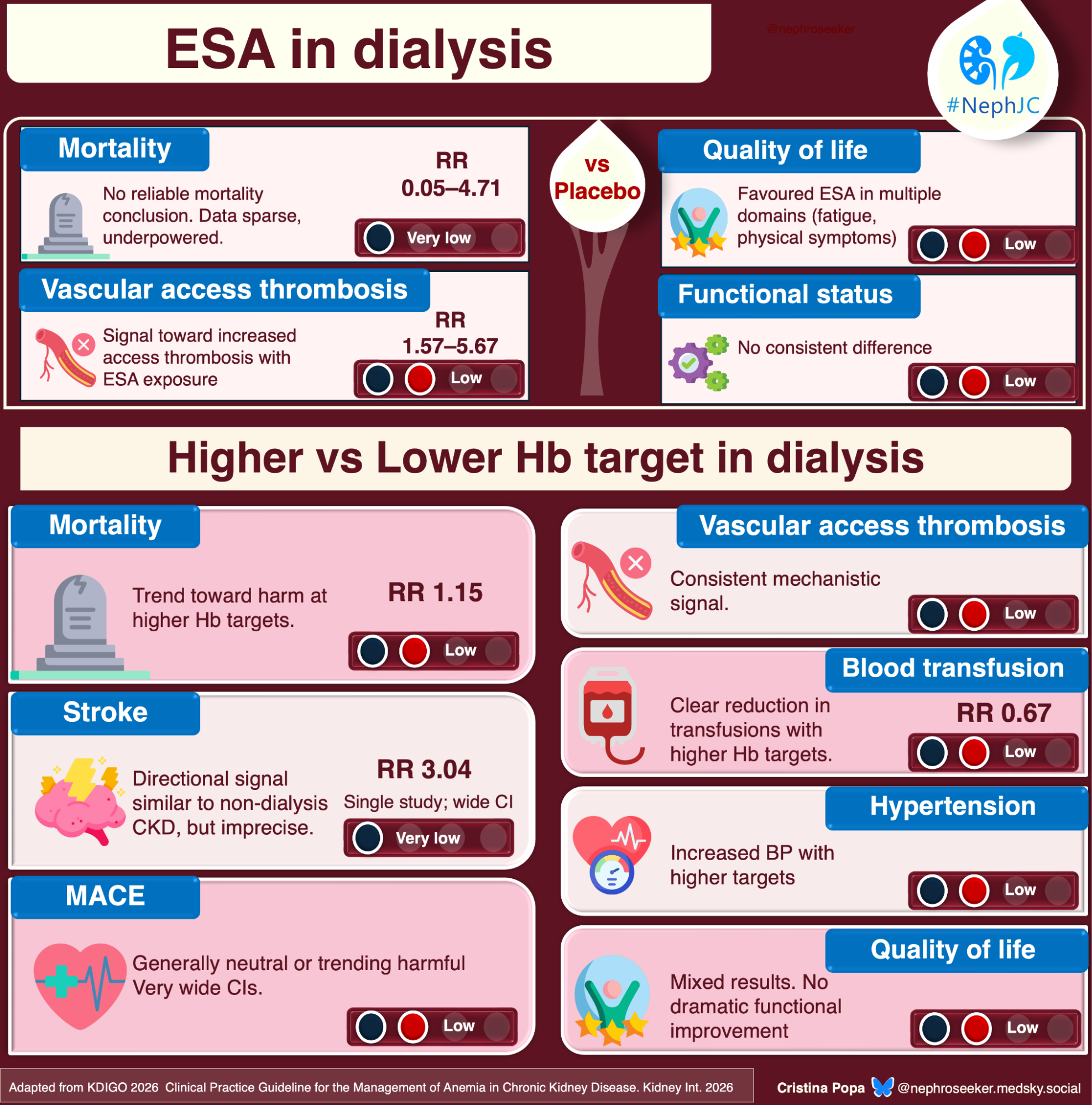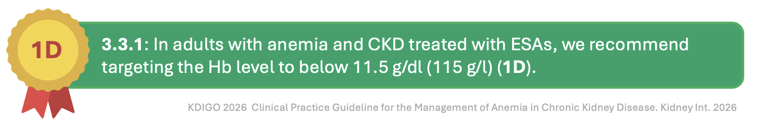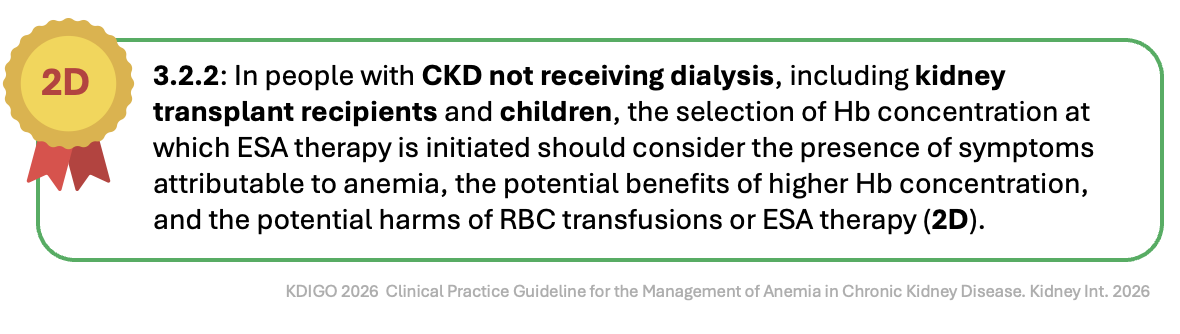 For non-dialysis CKD, KDIGO 2026 takes a different posture, abandoning a fixed threshold in favor of shared decision-making. The guideline suggests considering the presence of symptoms attributable to anemia, the potential benefits of higher hemoglobin, and the potential harms of RBC transfusion or ESA therapy. This echoes the KDIGO 2012 recommendation, but is now graded 2D (vs 1B in the 2012 recommendation 3.2, and 3.4.2- 2C), making explicit the very low certainty. In practice, this means ESA initiation might occur at Hb 8.5 g/dl in high-risk patients (recent stroke, thrombosis history, active cancer with curative intent) or at Hb 10 g/dL in a symptomatic patient pursuing a kidney transplant. The guideline does not specify exact thresholds for these subgroups; instead, it defers to clinician judgement informed by shared discussion. This transparency about uncertainty is commendable, but creates ambiguity. Two nephrologists facing a non-dialysis patient with a Hb of 9.5 g/dL, dyspnea, or prior stroke could reach opposite decisions under this framework, and both could be guideline-concordant.