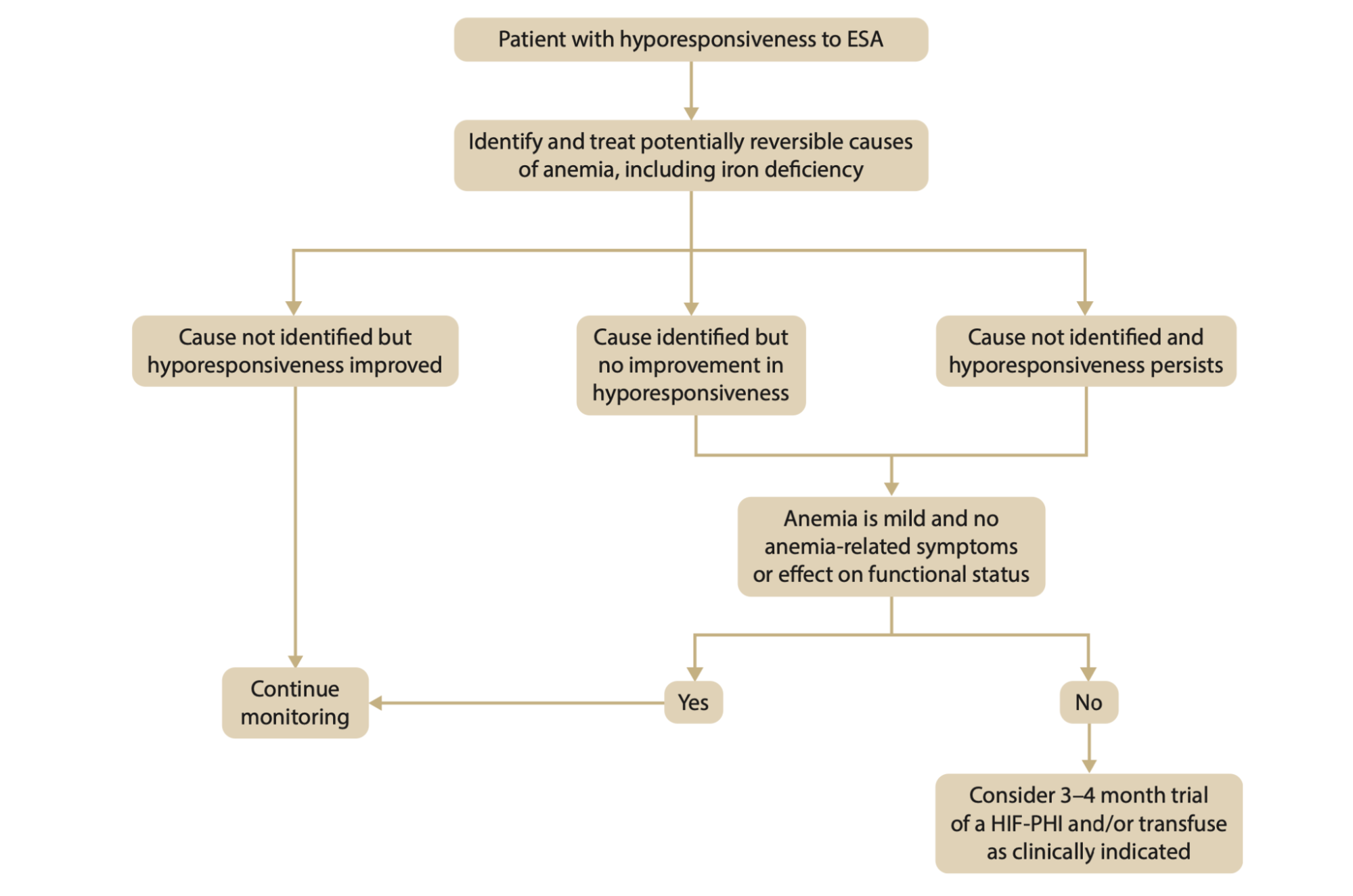 If hyporesponsiveness persists despite evaluation and correction, management depends on anemia severity and symptoms: continue monitoring if mild and asymptomatic, or consider a 3–4 month trial of a HIF-PHI (stop HIF-PHI if Hb unchanged, ungraded) and/or transfusion as clinically indicated.