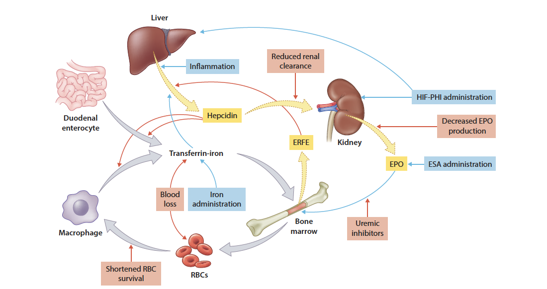 Anemia in CKD is more than simply limited iron availability for red blood cell (RBC) production. This arises from multiple factors: ongoing blood loss, nutritional shortfalls, drugs impairing iron absorption (e.g., PPIs), elevated hepcidin (the iron-regulatory hormone that blocks dietary iron uptake and sequesters iron in stores), and increased iron demand during ESA-driven erythropoiesis. The complexities of iron absorption and utilization, EPO production and bone marrow output are visualized below.