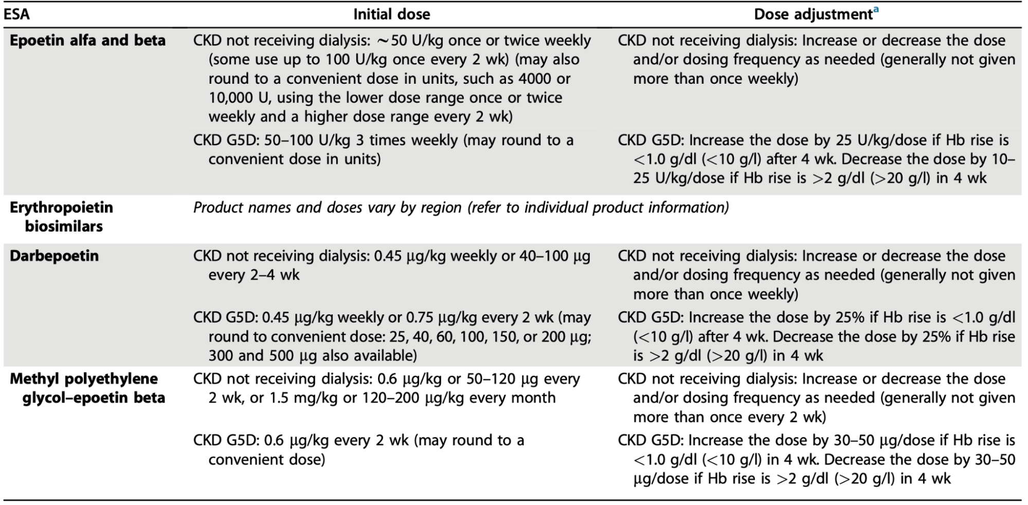 Table 7. Dosing of ESAs from 2026 Clinical Practice Guideline for the Management of Anemia in Chronic Kidney Disease