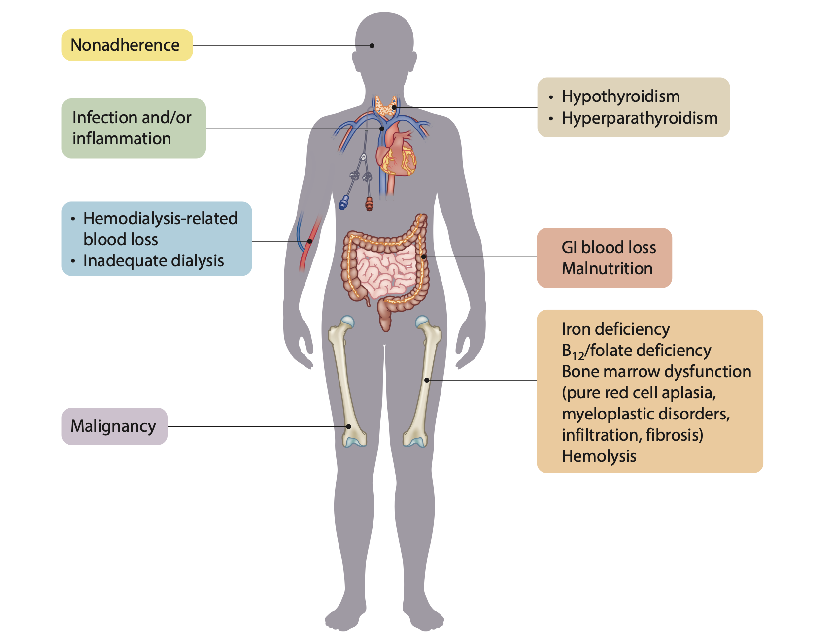 Etiology: The underlying causes are complex and multifactorial. Common drivers include absolute or functional iron deficiency, chronic inflammation (the "anemia of inflammation"), and secondary hyperparathyroidism.
