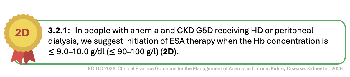 KDIGO 2026 maintains the same hemoglobin threshold for ESA initiation in dialysis (HD or PD) patients as did the 2012 guideline: start therapy when hemoglobin falls to or below 9-10 g/dL. This recommendation carries grade 2D (weak recommendation/very low certainty), signaling that while evidence supports starting ESA in this range, the certainty is limited. The rationale draws from observational and trial data showing that untreated dialysis patients rapidly progress to Hb <8g/dl, with associated transfusion requirement and poor functional status. An early landmark Canadian trial randomised patients on dialysis with Hb <9 g/dL to placebo, low-target ESA (Hb 9.5-11 g/dL), or high-target ESA (Hb >11 g/dL) and found that 58% of placebo recipients required transfusion within 8 weeks, compared with 2.5% in each ESA arm (Canadian Erythropoietin Study Group, BMJ, 1990). This trial established the principle that ESA prevents transfusion dependency, but it doesn’t answer whether Hb 9.5%g/dL is superior to 10.5g/dL as an initiation threshold, nor does it validate the exact 9-10g/dL window.