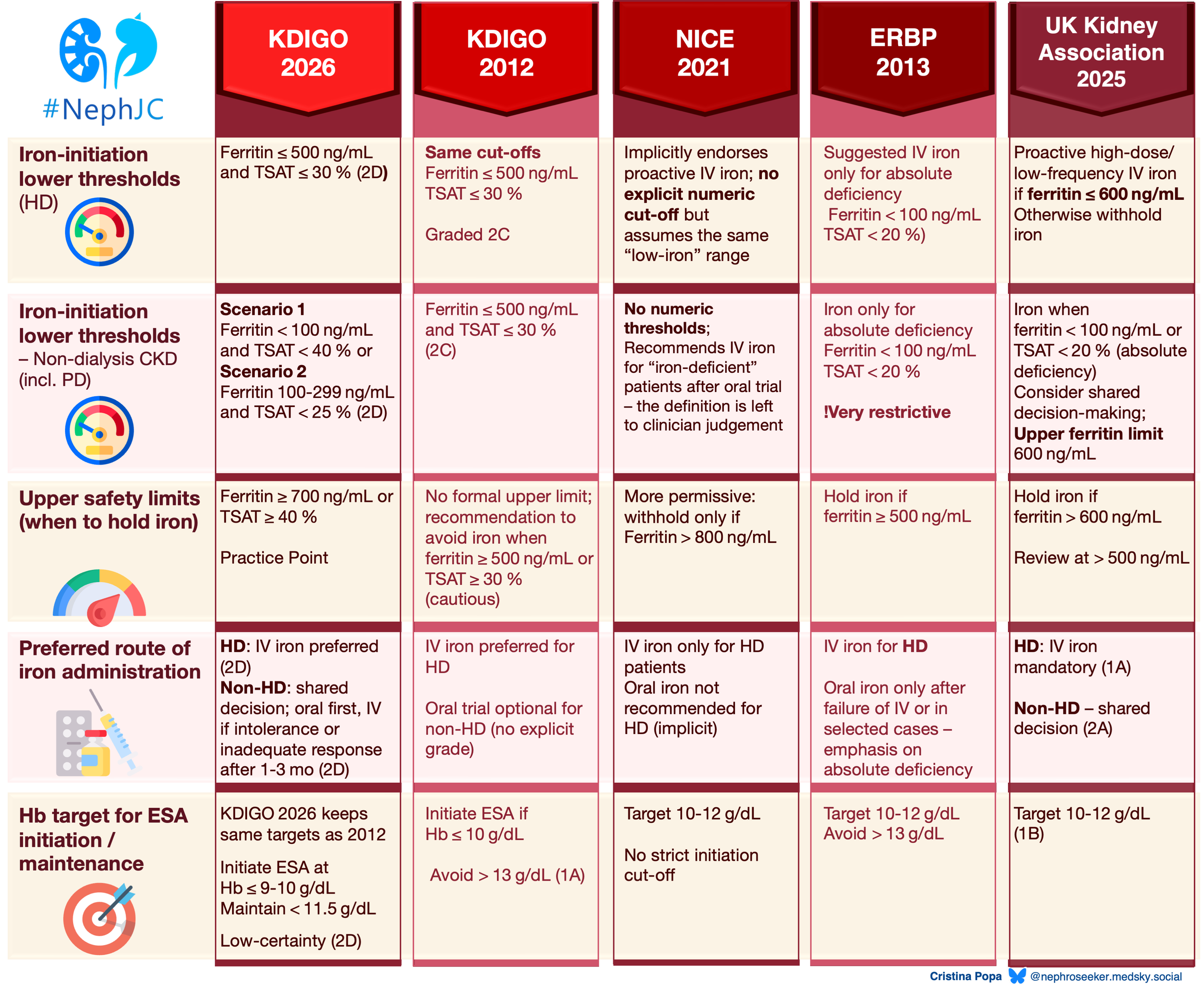 ERBP (Locatelli et al, NDT, 2013; Stoumpos et al, NDT, 2024) prefers the older, more conservative thresholds (absolute deficiency: ferritin <100ng/mL, TSAT <20%). The 2026 commentary (Del Vecchio et al NDT 2026) endorses KDIGO’s proactive HD approach but cautions against liberal iron in patients with high CRP, effectively re-introducing inflammation-adjusted decision-making that KDIGO 2026 glosses over.