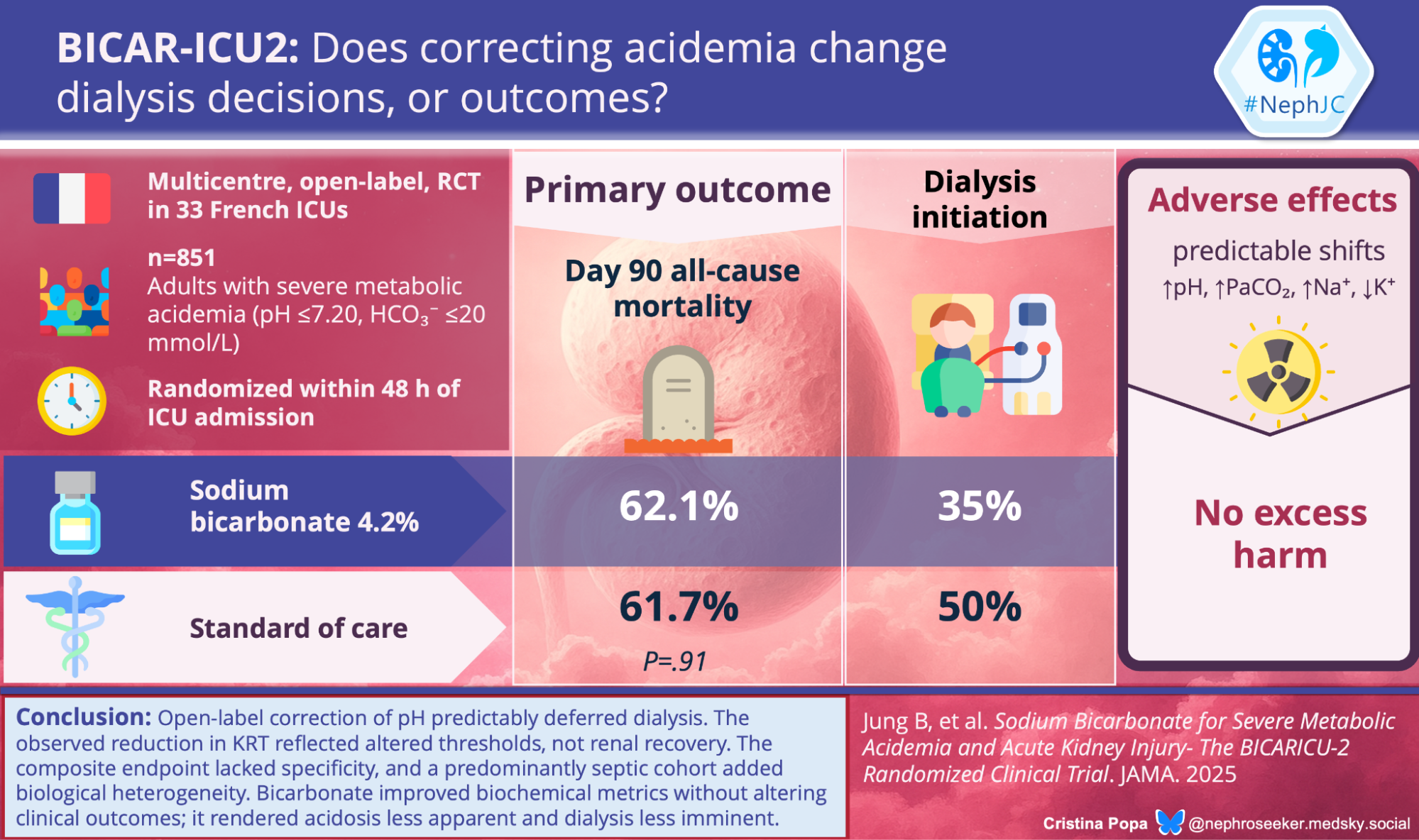 BICAR-ICU2 (Jung B, JAMA, 2025) enrolled 628 patients across 43 French ICUs, all with severe metabolic acidosis (pH≤ 7.20, bicarb≤ 20mmol/L) and KDIGO stage 2-3 AKI. Patients received open-label 4.2% sodium bicarbonate titrated to pH ≥ or standard of care. 90-day mortality was neutral (62.1% vs 61.7%).