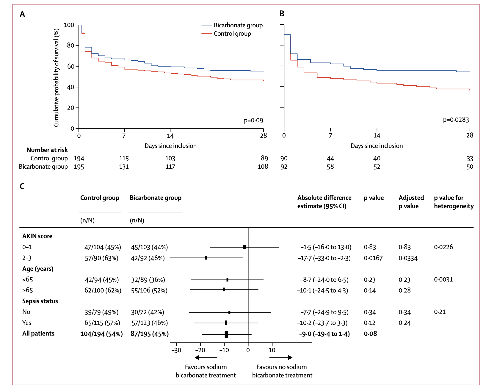 Figure 2A Time to death in the overall population, and 2B patients with prespecified acute kidney injury, and 2C the 28-day mortality risk difference in the overall population and in the three prespecified strata, from Jaber et al, Lancet, 2018