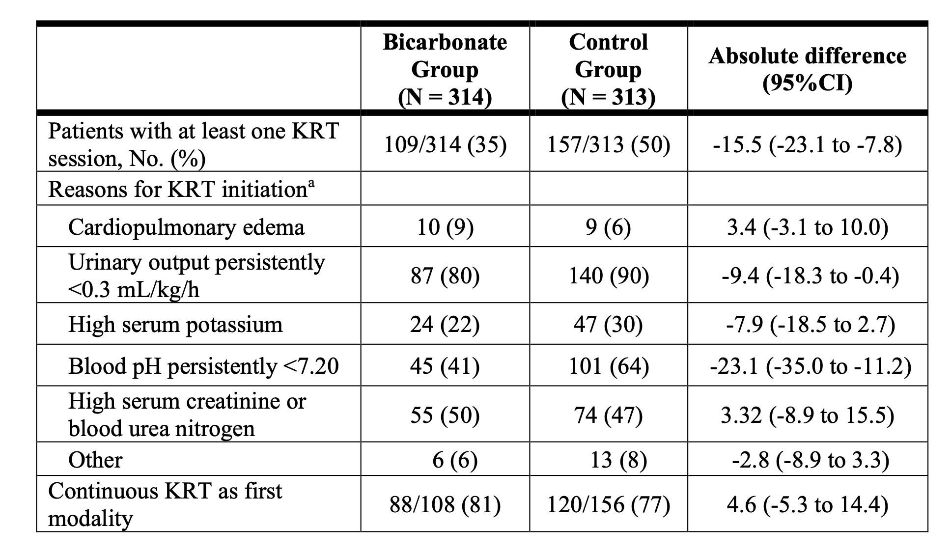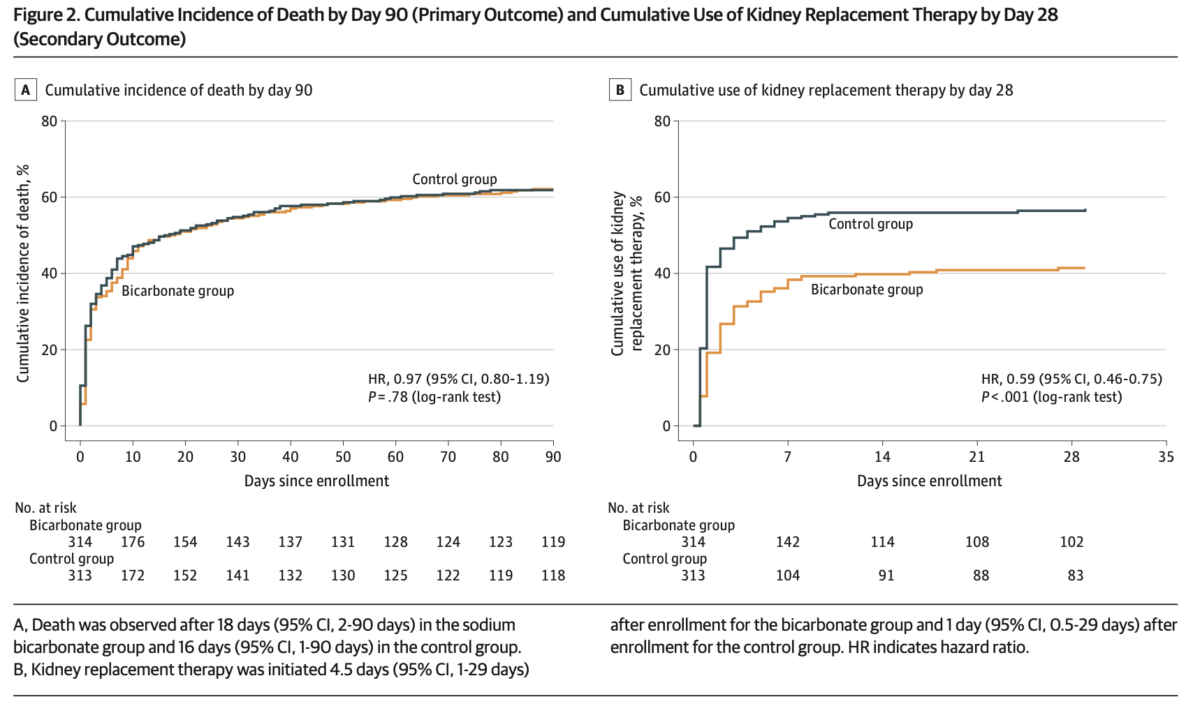 Renal benefit rests almost entirely on a delay and reduction in RRT. Median time to RRT initiation was doubled with bicarbonate (31h vs 16h), producing a lower cumulative incidence of dialysis over 28 days (HR 0.59; 95% CI 0.46-.0.75). Yet, this difference reflects how clinicians responded to corrected acidemia more than how the kidneys recovered.